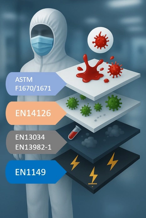- EN 14126: Pathogen protection performance for isolation and protective apparel.